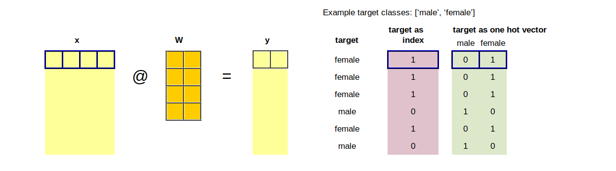 print('The same, one hot encoding:\n', yy)Target as index: tensor([1, 1, 1, 0, 1, 0])